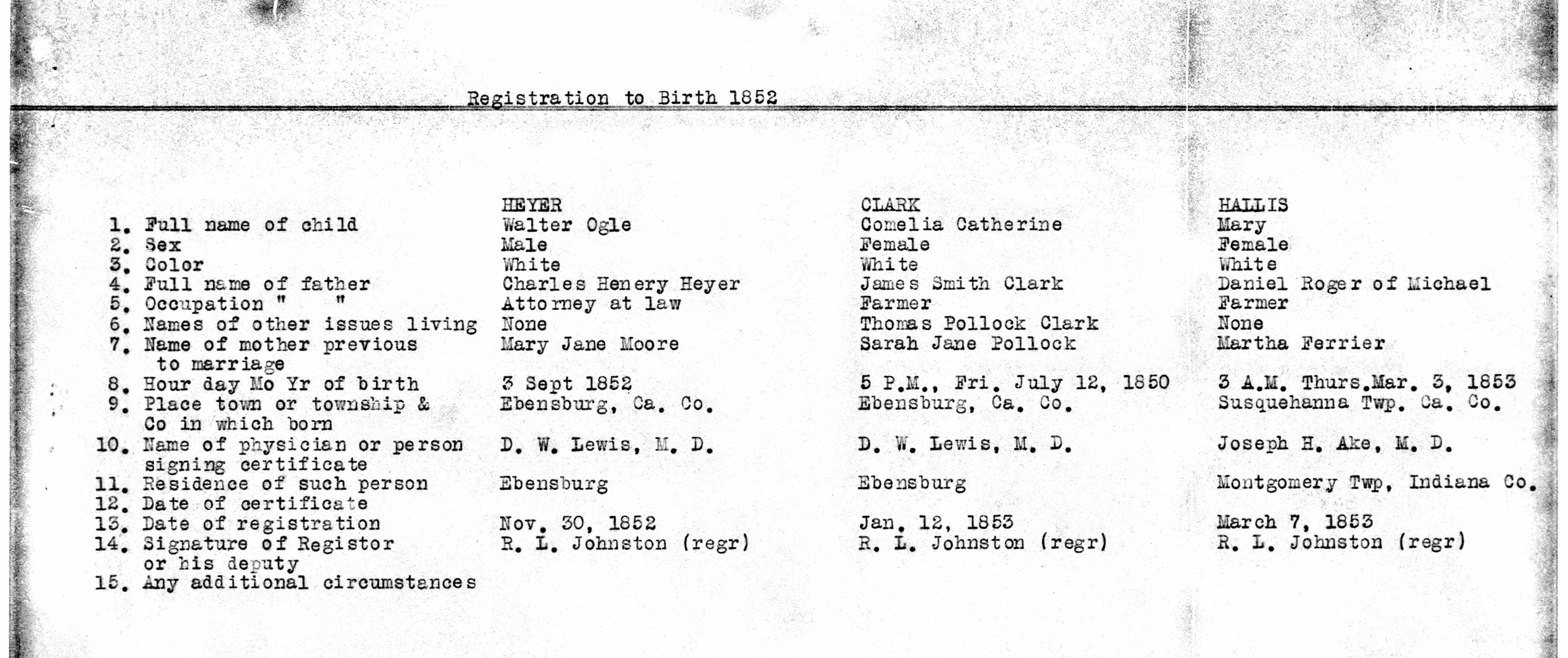 - Cambria Pennsylvania Births 1852-1854 01, HEYER, CLARK, HALLIS, MOORE, POLLOCK, FERRIER