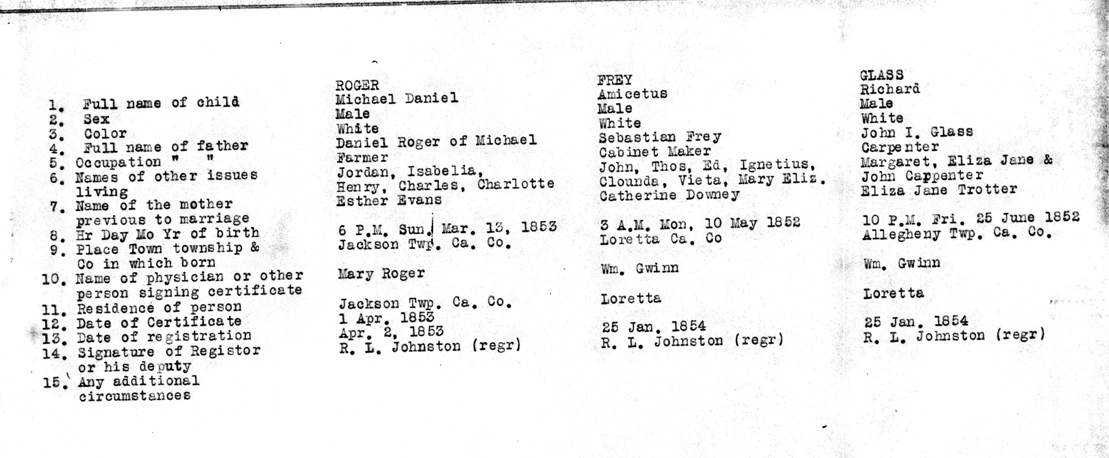 - Cambria Pennsylvania Births 1852-1854 02, ROGER, FREY, CLASS, EVANS, DOWNEY, TROTTER