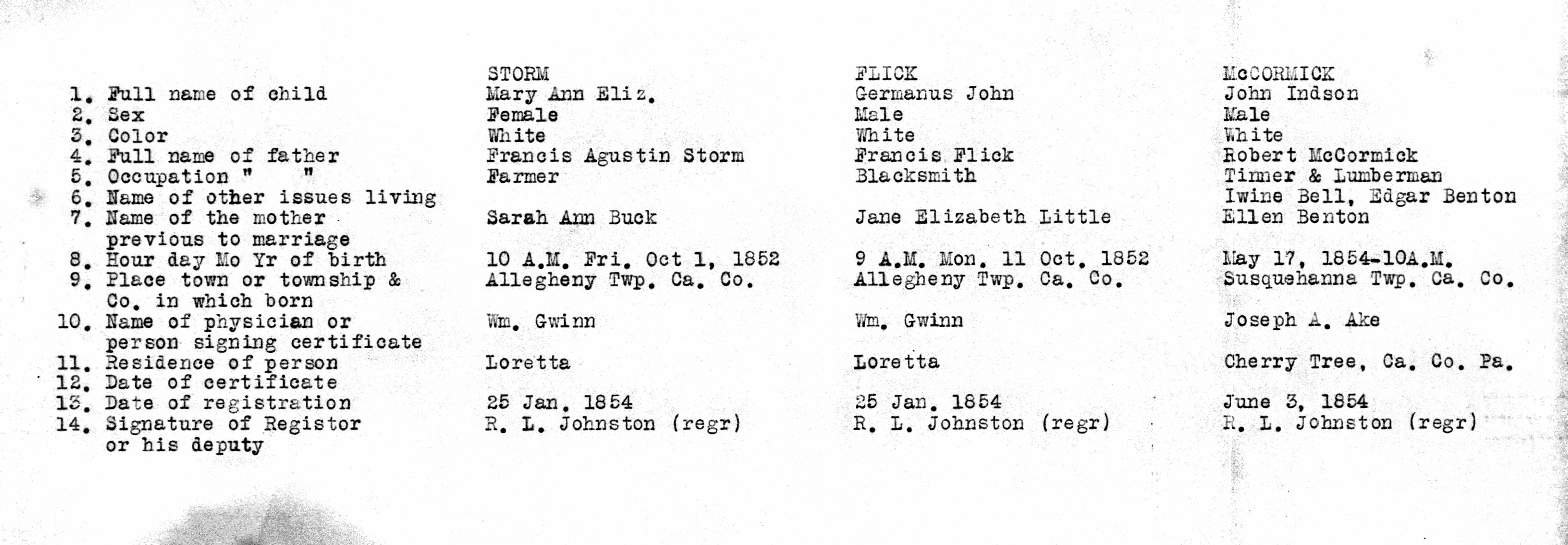 - Cambria Pennsylvania Births 1852-1854 04, STORM, FLICK, McCORMICK, BUCK, LITTLE, BENTON