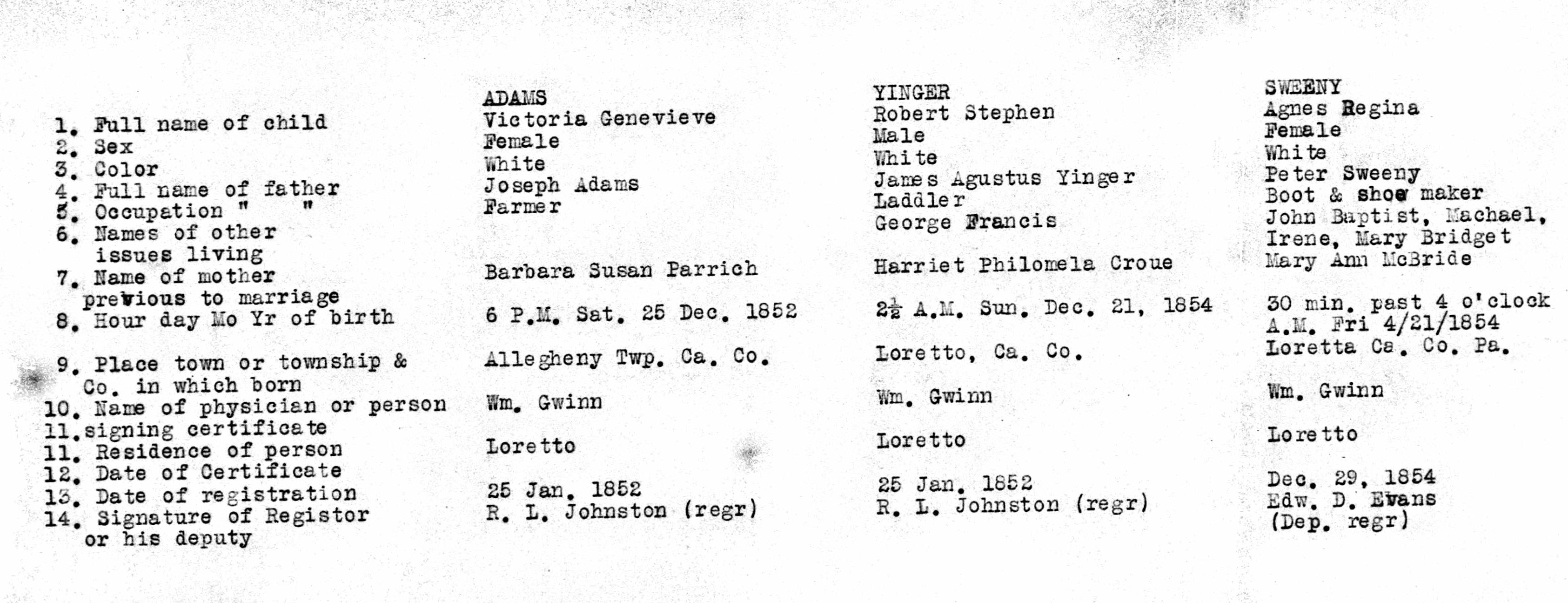 - Cambria Pennsylvania Births 1852-1854 05, ADAMS, PARRACH, YINGER, CROUE, SWEENY, McBRIDE