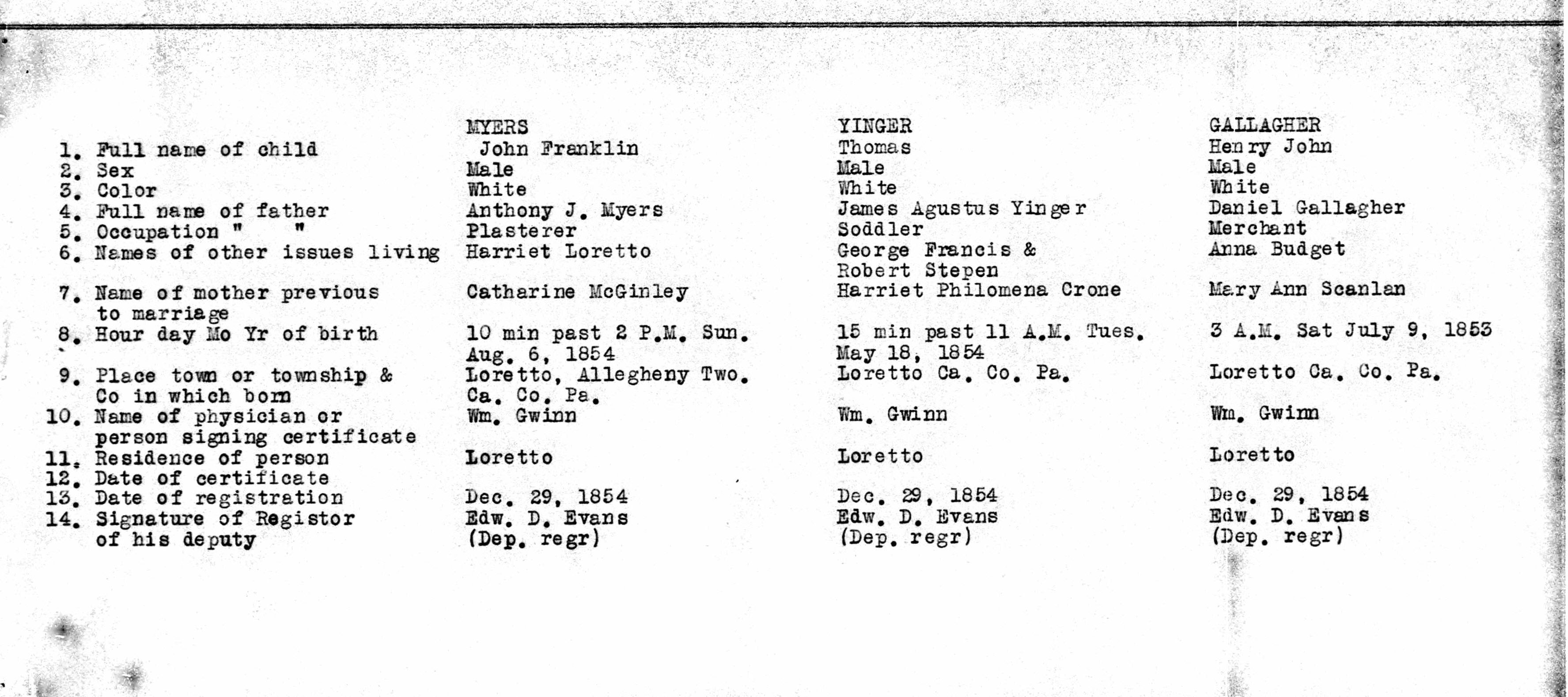 - Cambria Pennsylvania Births 1852-1854 09, MYERS, YINGER, GALLAGHER, McGINLEY, CRONE, SCANLAN