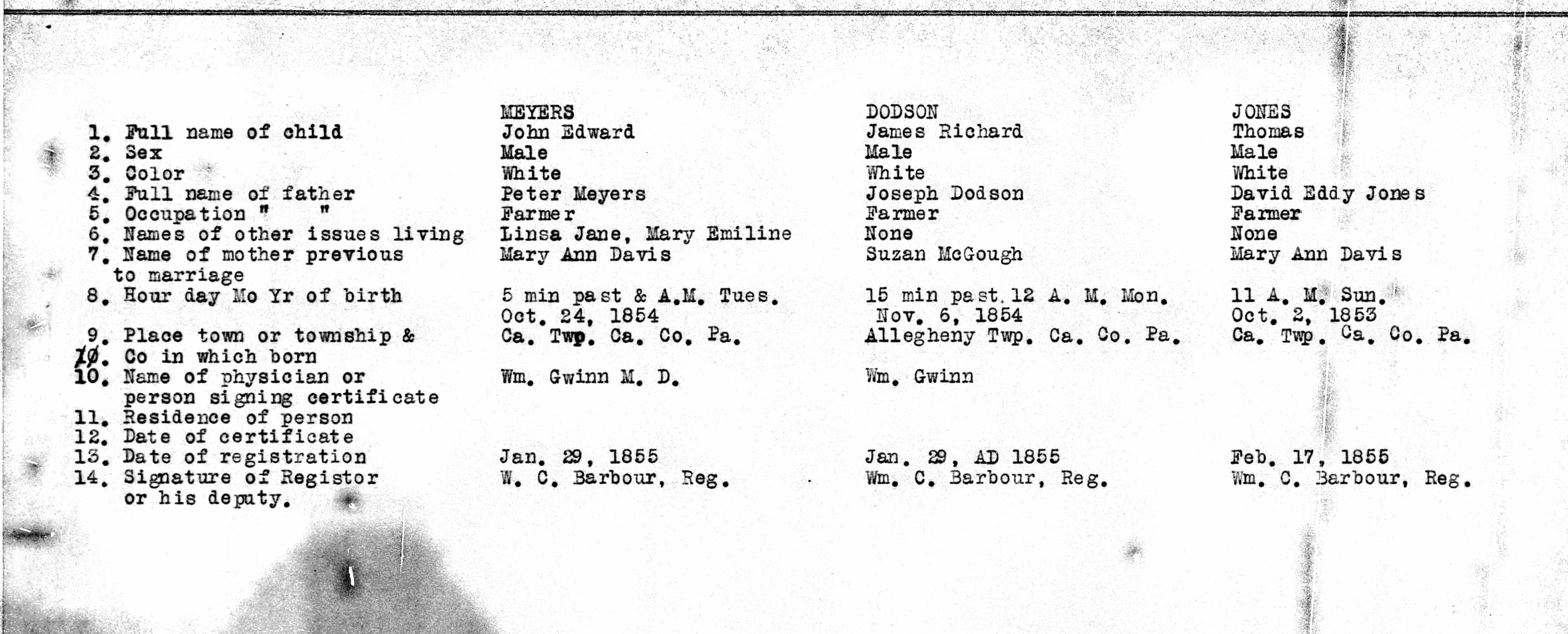 - Cambria Pennsylvania Births 1852-1854 11, MEYERS, DODSON, JONES, DAVIS, McGOUGH,