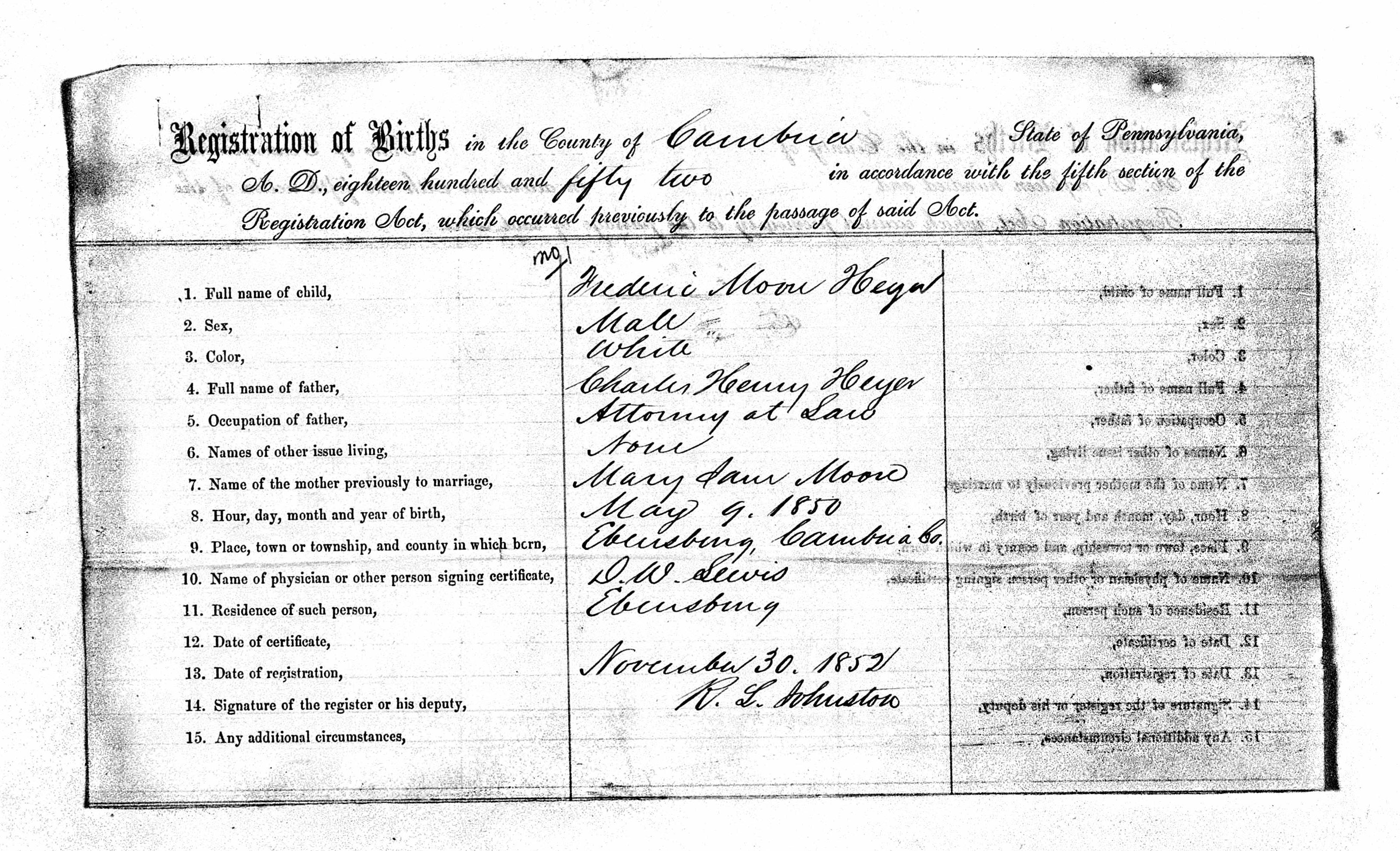 - Cambria Pennsylvania Births 1852-1854 14, HEYER, MOORE